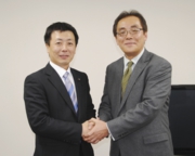 12月に来県した片田教授と防災の連携を交わしました。 南海トラフ巨大地震などの大規模災害に備え、徳島県内の商工3団体青年部でつくる「次世代プロジェクト会議」が2012年11月6日夜、災害発生時に周辺住民の先頭に立って避難する「率先避難企業」の普及をテーマにした勉強会を徳島市の徳島経済産業会館で開催されました。勉強会には、会員企業44社の60人が集まり、役割や意義について理解を深めました。