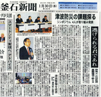 昨年1月に開催された釜石市主催の津波防災シンポジウムに招待パネリストとして参加しました。徳島県で展開している、“率先避難企業”の取り組みを釜石で紹介してほしいと片田教授(群馬大学)からの依頼でした。現地で聞いた釜井市職員の方の「我々の教訓を活かして徳島の方々が防災に努めてくれていることが、無念のうちになくなった多くの死者に対する一番の追悼であり、弔いになるんです。」 という言葉に胸が熱くなりました。