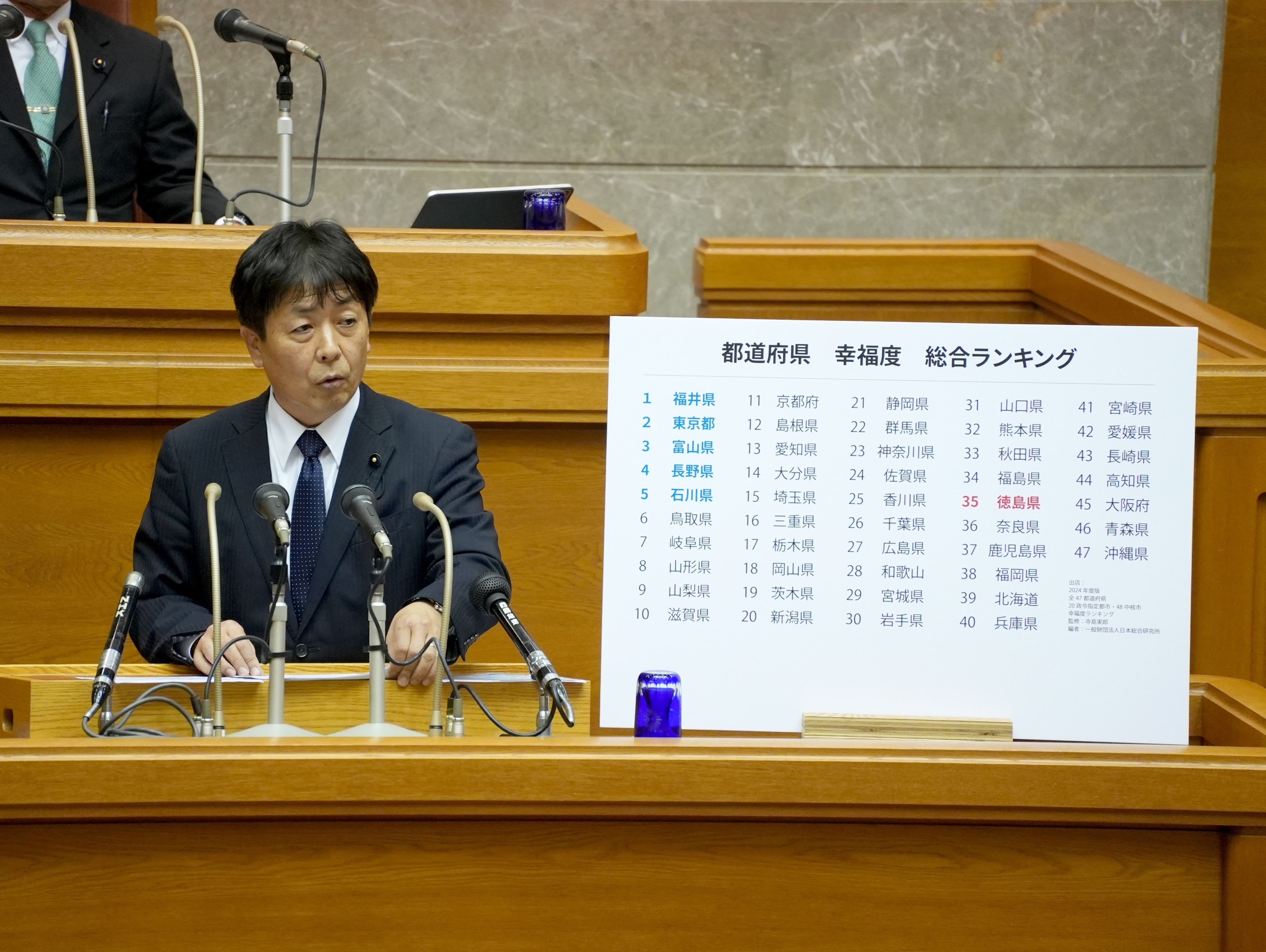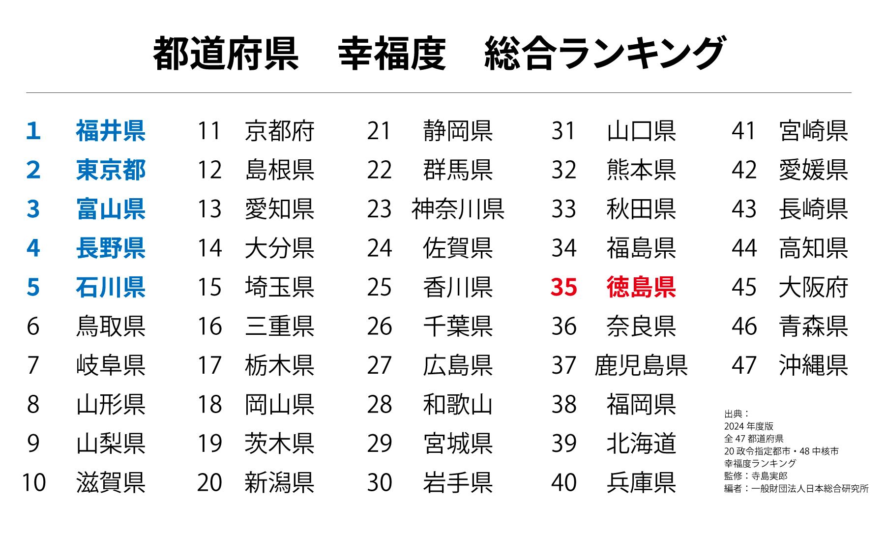 2014年版47都道府県 幸福度ランキングという本によると、徳島県は総合ランキングで全国35位。徳島の悪い指標は、生活習慣病受領者数47位、汚水処理人口普及率47位、学童保育設置率46位、道路整備率45位等々です。